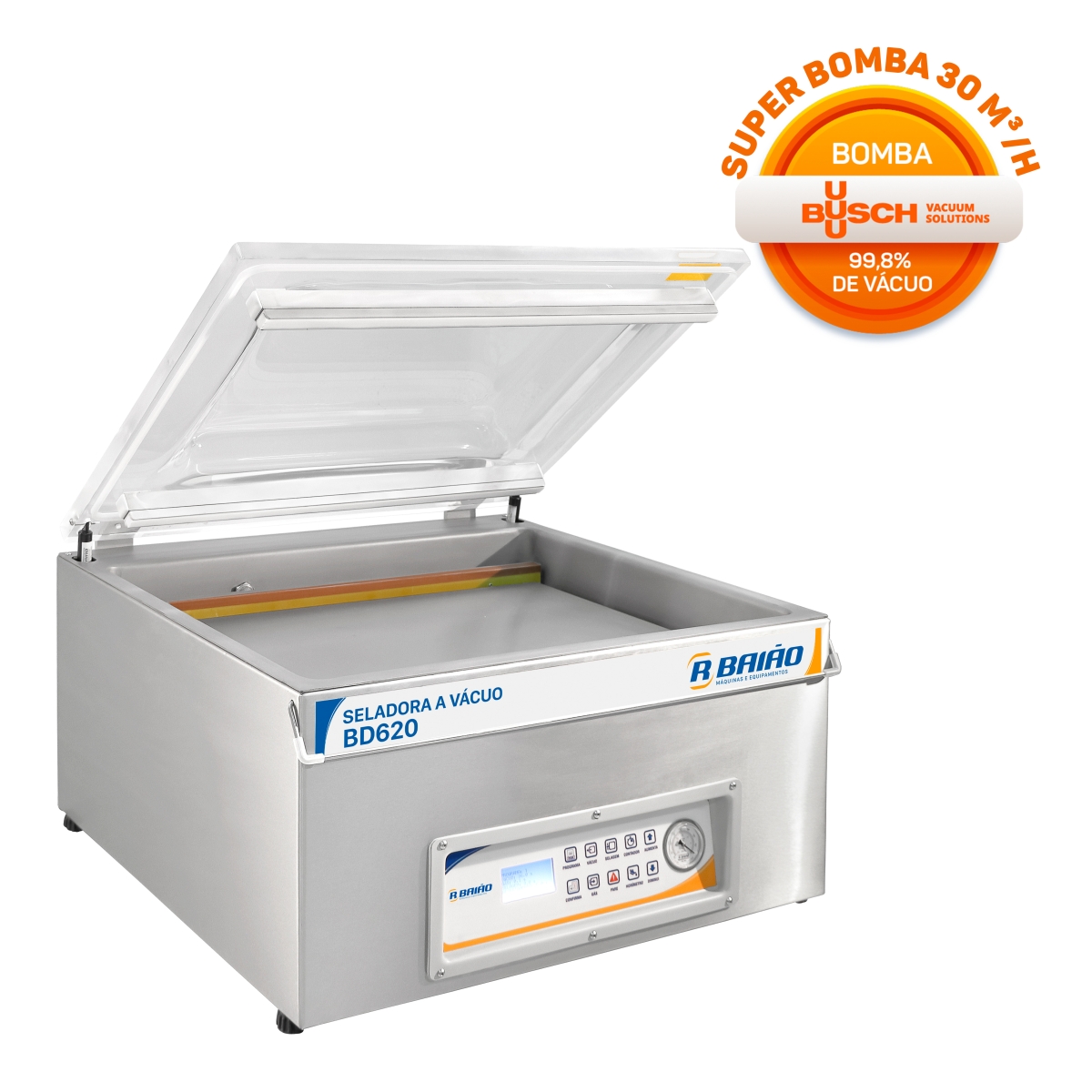 A Seladora a Vácuo de Câmara BD620, é construída em estrutura de aço inox 304, com tampa de acrílico de 25 milímetros, barra de selagem em fibra de vidro acionada por cilindros, garantindo maior durabilidade e cuba com cantos arredondados para facilitar a limpeza. Possui painel digital impermeável de acordo com a classificação IP65 e memória para 15 programas, contador de processos, horímetro que indica o momento de trocar o óleo e botão “PARE” para interromper o processo em qualquer estágio, caso seja necessário. |