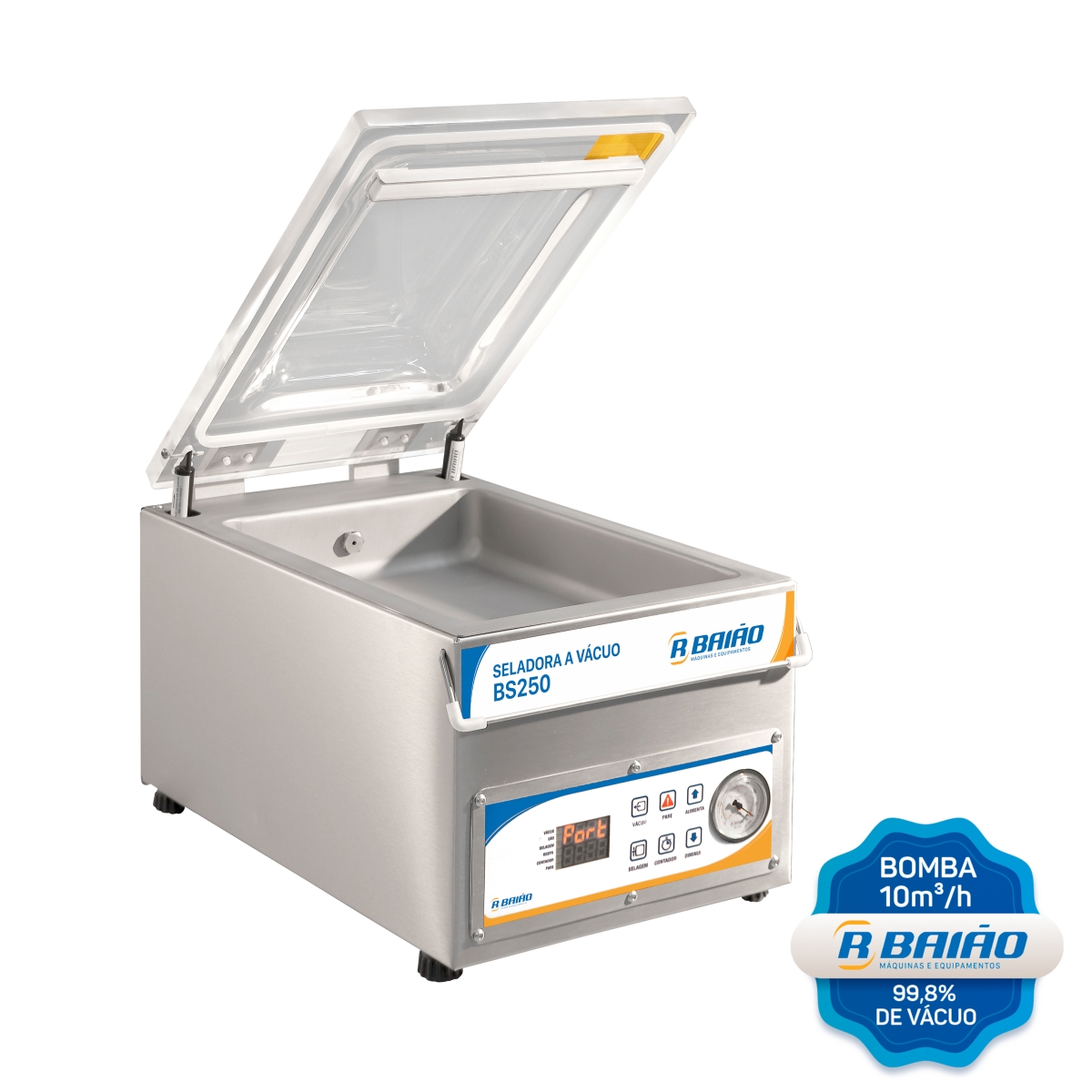 A Seladora a Vácuo de Câmara BS250, é construída em estrutura de aço inox 304, com tampa de acrílico de 20 milímetros, barra de selagem em fibra de vidro acionada por cilindros, garantindo maior durabilidade e cuba com cantos arredondados para facilitar a limpeza. Possui painel digital impermeável de acordo com a classificação IP65, contador de processos e botão “PARE” para interromper o processo em qualquer estágio, caso seja necessário. |